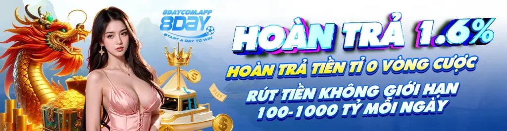8Day – Nhà cái lý tưởng dành cho những ai yêu thích sự kịch tính, đam mê chiến thắng và không muốn bỏ lỡ bất kỳ cơ hội làm giàu nào. Với nền tảng công nghệ hiện đại, bảo mật tuyệt đối cùng hàng loạt trò chơi hấp dẫn từ thể thao, casino đến slot game, nhà cái mang đến cho bạn trải nghiệm cá cược đỉnh cao, nhanh chóng và cực kỳ uy tín.